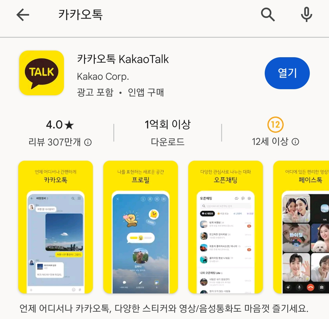 카톡이 이미 업데이트 된 상태라면 아래처럼 열기 버튼이 나타나고, 아니라면 업데이트 버튼이 나타납니다.